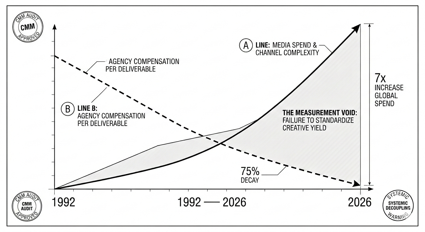 Michael Farmer's research (2026) shows that creative agency pricing has declined 75% in real terms over 33 years—from $435,000 to $110,000 per ScopeMetric Unit. Meanwhile, global media spend increased 7x over the same period. Creative investment collapsed while media investment exploded.
